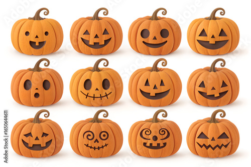 A group of eight lit spooky halloween pumpkins, Jack O Lantern with evil face and eyes isolated against a white background.