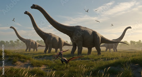 A group of four brachiosaurus dinosaurs standing in a field with pterodáctilo flying in the sky above them today now