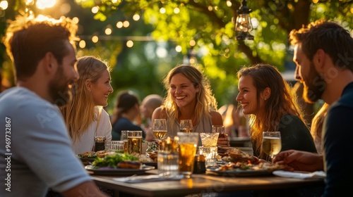 A group of friends gathers around a table outdoors, sharing laughter and delicious food as the sun sets, illuminated by twinkling lights and surrounded by greenery
