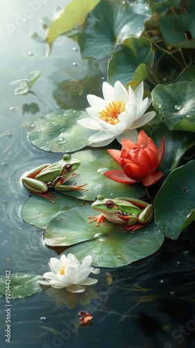 A group of frogs playfully interacting on a lush green lily pad.