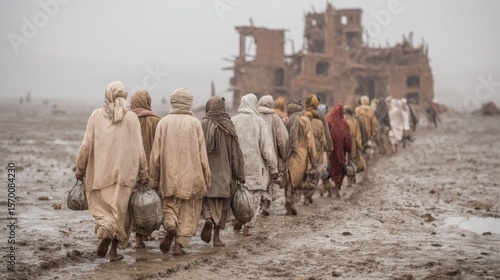 A group of individuals dressed in simple clothing walks in a line through muddy ground. They carry bags and head toward dilapidated buildings in a desolate setting at dusk.