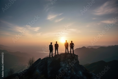 A group of individuals standing on the summit of a towering mountain, admiring the vast panoramic view below