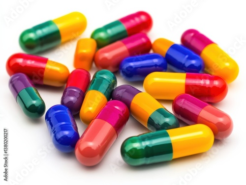 A group of multi-colored capsules spread out in a random pattern, isolated on white background