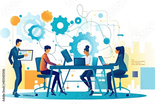 a group of people sitting at a desk with computers, Design a vector illustration of a dynamic team in a software development company