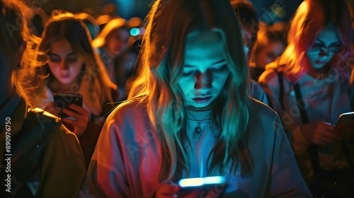 A group of people standing in a crowd, all looking at their smartphones. The image is lit with neon lights, creating a vibrant and energetic atmosphere.