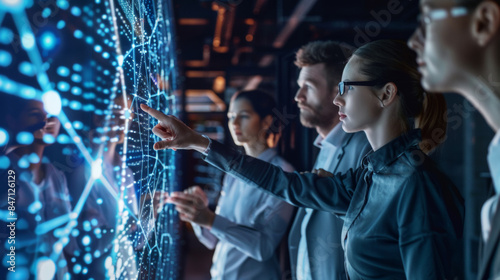 A group of people standing in front of a large screen