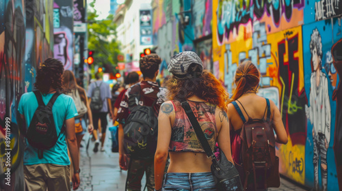 A group of people walking down a street with graffiti on the walls