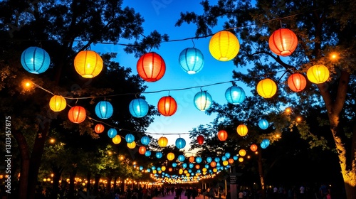 A group of people walking down a street with many colorful lanterns hanging from the trees