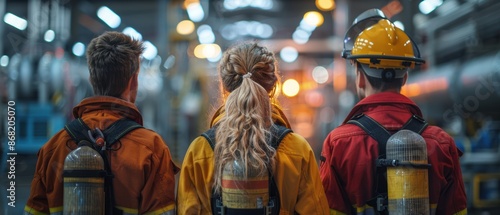 A group of professionals, including a scientist, a manager, and a firefighter, standing with their backs to the picture, gazing outside.