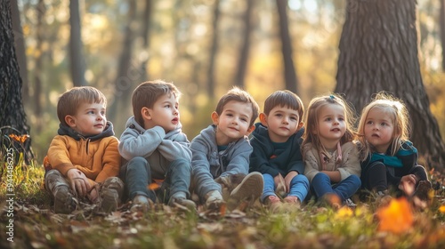 A group of six children sitting together on the forest floor in autumn, surrounded by colorful leaves and trees during a sunny afternoon