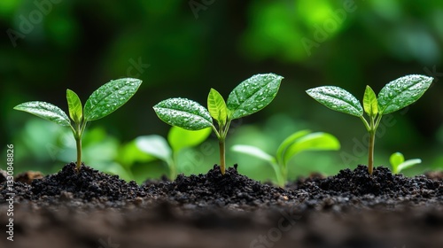 A group of small green plants growing together in a natural setting surrounded by rich soil