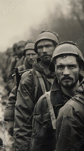 A group of soldiers in the rain.