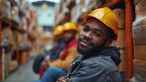 A group of warehouse workers taking a break, diverse team in a logistic center's lounge area