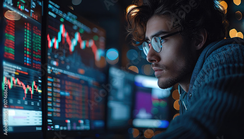 A guy working at a computer, trading stocks, but he is losing money and his expression is not good.