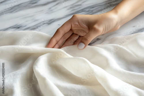 A hand gently caressing smooth, off-white fabric, showcasing its luxurious texture.