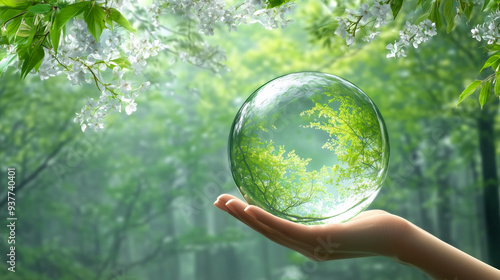 A hand holding a glass sphere reflecting a vibrant green forest, surrounded by delicate white flowers.