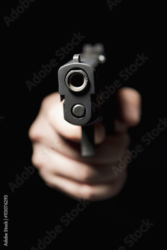 A hand holding a gun and pointing it at the camera, black background