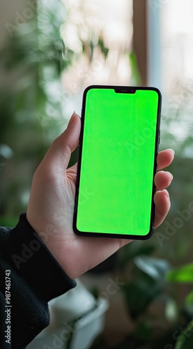 A hand holding a smartphone with a green screen, surrounded by plants.