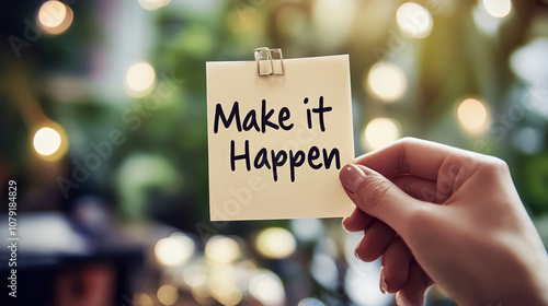 A hand holding a sticky note with the motivational message "Make it Happen" against a softly lit background. This image conveys ambition, inspiration, and a proactive mindset.