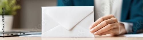 A hand holds a white envelope on a desk, with a laptop and a small plant in the background, communication or correspondence, Year-End team appreciation with blank space for text