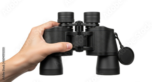 a hand holds binoculars exploring new horizons, adventures await, isolated on transparent background