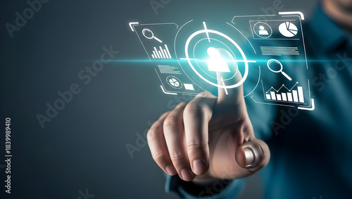 A hand interacts with a glowing futuristic interface displaying data analysis and user icons