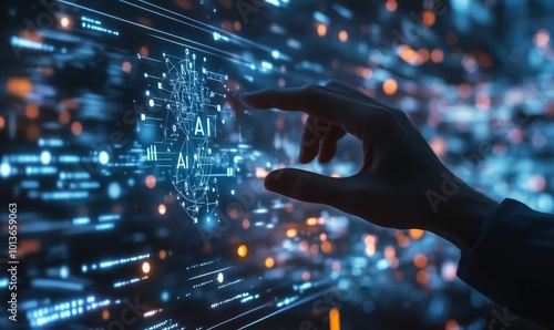 A hand interacts with digital AI interface.