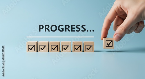 A hand is placing a wooden block with a check mark to complete a progress bar, symbolizing success and advancement