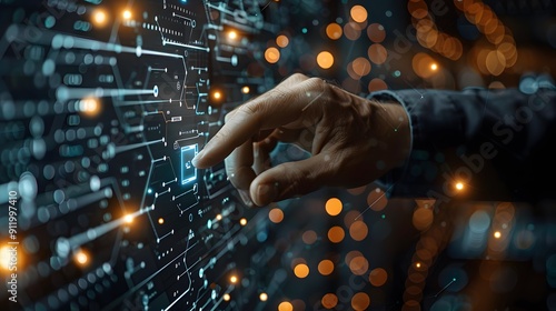 A hand pointing at a computer screen with a blue button. Concept of technology and the importance of using it to make decisions