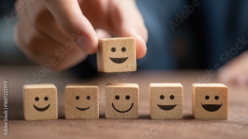 A hand reaches towards a stack of smiley face blocks arranged on a wooden surface, showcasing a playful and uplifting atmosphere focused on happiness and well-being