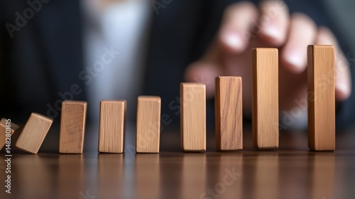 A hand stops falling wooden blocks, symbolizing control in a chaotic situation. long_title:A hand reaches out to stop a row of wooden blocks from