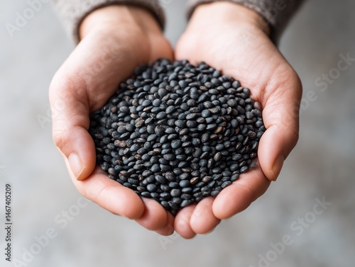 A handful of beluga lentils being presented for a healthy ingredient