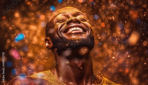 A handsome man surrounded by sparkles: a portrait of a happy man with closed eyes and a raised head. Generative AI