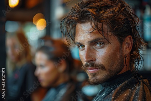 A handsome young man looking smart in a white barber's cape awaiting a haircut