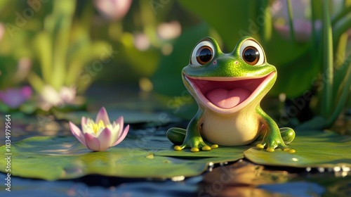 A happy 3D cartoon frog with big eyes and a wide smile, sitting on a lily pad, radiating playful energy
