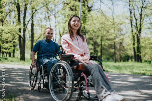 A happy couple spending quality time outdoors, enjoying the natural surroundings and sunshine, demonstrating connection, and positivity while in wheelchairs, embracing life and nature together.