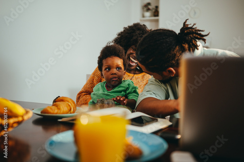 A happy diverse family at the breakfast table at home.