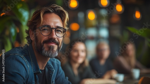 A happy man smiles warmly while sitting with friends in a coffee shop. The image conveys a sense of community and contentment. Production Manager lead a team meeting