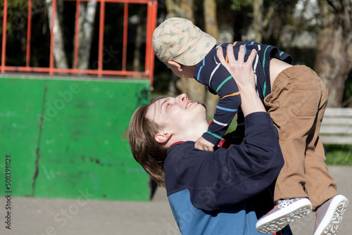 A happy older brother, a teenager, holds his little, cheerful brother in his arms on a walk in the park, in the yard.