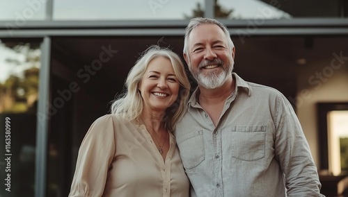 A Happy Senior Couple Standing in Front of Their Modern Home, Smiling and Lovingly Hugging Each Other