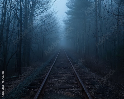 A haunting, atmospheric photograph of an abandoned railway track stretching into a foggy, mysterious forest, muted colors, eerie lighting