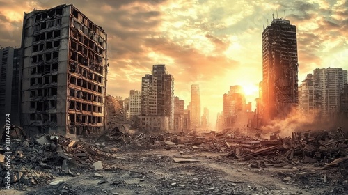 A haunting cityscape showcases crumbling buildings.
