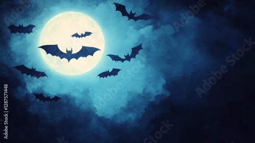 A haunting night scene features a full moon surrounded by dark clouds and silhouettes of bats in flight.
