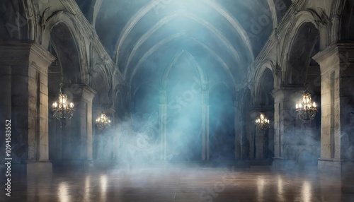 A Hauntingly Beautiful Abstract Renaissance Gothic Hall with Dramatic Light, Shadows, and Atmospheric Smoke Creating a Mysterious Ambience in an Empty Grand Space więcej treści