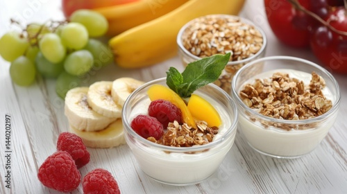 A healthy and vibrant breakfast: fruit, yogurt, and granola on white wood.