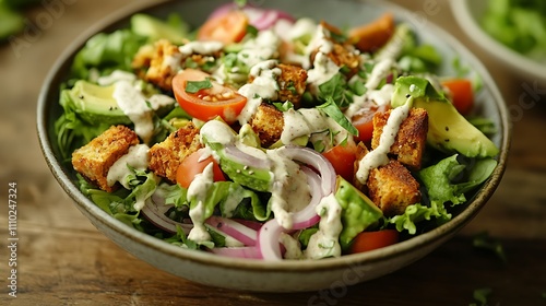 A healthy vegan salad on a rustic wooden table, featuring ingredients like avocado, tomatoes, red onions, and a tahini dressing