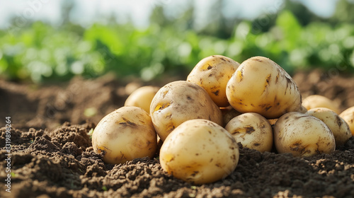 A heap of raw potatoes sits on the soil in the field, ready for harvest.