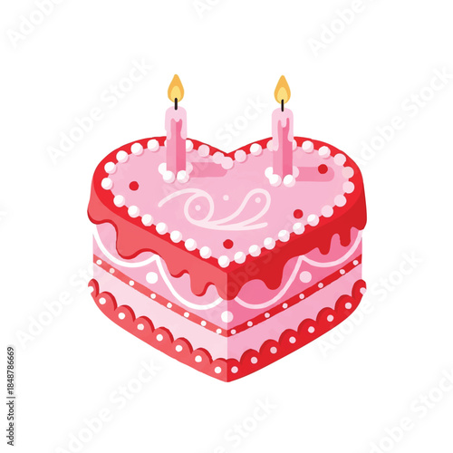 A heart-shaped pink birthday cake with two lit candles on top, decorated with white icing and red frosting against a clean white background.