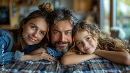 A heartwarming family moment captured indoors, with a father and his two daughters sharing a close, loving embrace, surrounded by the warmth of their home.
