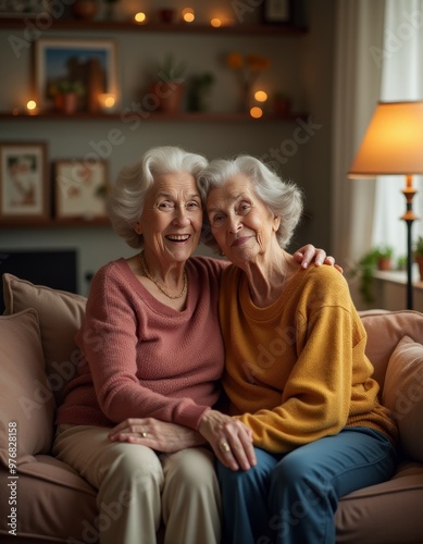 A heartwarming image of an elderly LGBT couple sitting together on a cozy couch, smiling and embracing each other in a warm, homely setting. Perfect for themes of love, companionship, and inclusivity.